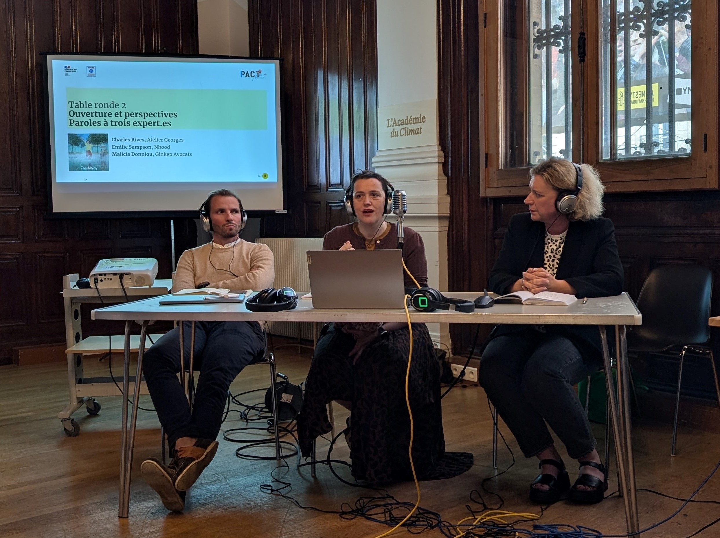 Participants : Charles Rives (architecte urbaniste, docteur en architecture au sein d'Atelier Georges), Emilie Sampson (directrice du Pôle Aménagement au sein de Nhood), Malicia Doniou (avocate co-fondatrice du cabinet d'avocats Ginkgo avocats)